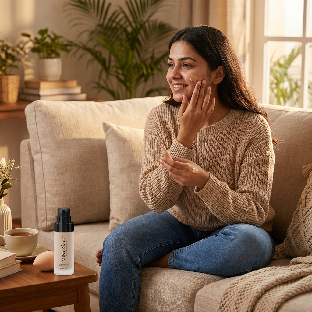 Apply to the face and blend with fingertips, beauty sponge, or foundation brush.